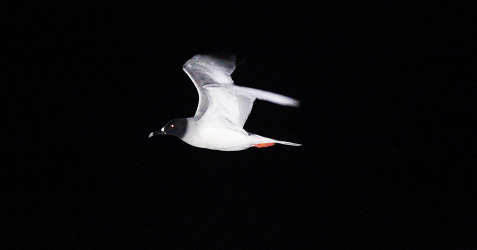 The second night was basically my last night for what for me is one of the coolest looking gulls of the oceans, the Swallow-tailed Gull. And as any intense target birder will do it I went to bed with my alarm set for 1am, then to 2am and then to 3am to look for the Gull at different hours of the night. Wake up the first time and went up the stairs and first thing I got is this heavy strong and deep flight of a nice individual of Swallow-tailed Gull flying right next to our boat at eye level maybe 4 to 6 meters, the bird was always staying at a constant speed over the waves created by our boat and occasionally stops suddenly to go straight down and pick up what it seems to be a squid that thanks to the waves created by our boat were easier to catch (see sequence of photos below).
